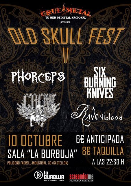El próximo sábado 10 de octubre se celebrará en Castellón la segunda edición del Old Skull Fest. Un festival que reunirá a los madrileños Phorceps, quienes presentarán su segundo EP "Viene a Por Ti", los barceloneses Ravenblood, los locales Crow y desde Vilareal Six Burning Knives con su cierre de gira presentación de "VI".