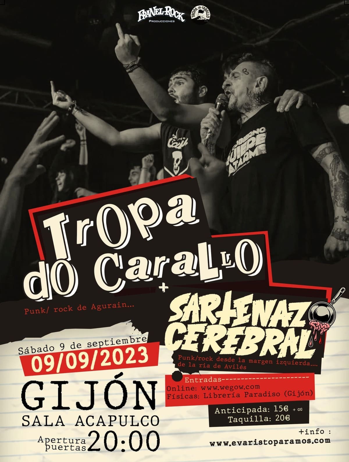 Tropa Do Carallo, la nueva formación del mítico Evaristo Páramos, estará en Asturias el próximo sábado nueve de septiembre. Como banda invitada contarán con los asturianos Sartenazo Cerebral que presentarán los temas de su último EP "10 Años". La cita será una vez más en la Sala Acapulpo de Gijón que abrirá sus puertas a las 20:00h. Entradas físicas en Librería Paradiso de Gijón y online en wegow a un precio de 15€ (+ gastos) en anticipada y 20€ en taquilla.