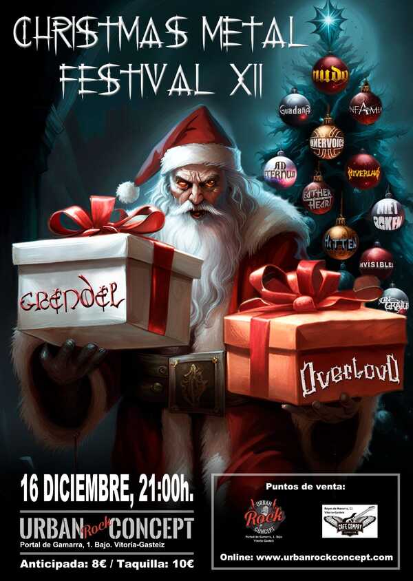 Se acercan las fechas navideñas y con ellas el tradicional Christmas Metal Fest en Vitoria, que en su duodécima edición contará con los locales Grendel y como banda invitada Overloud desde Donosti. La cita será el próximo dieciséis de diciembre en la Sala Urban Rock Concept que abrirá sus puertas a las 21:00h.