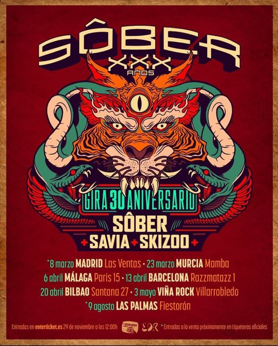 La gira de celebración del 30º aniversario de Sôber ya es una realidad y presenta sus fechas, en la que acompañarán Savia y Skizoo, como ya hicieran en la gira 20º aniversario. Las fechas confirmadas son las siguientes: