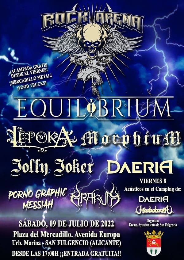 Este sábado 9 de julio la Plaza del Mercadillo de San Fulgencio (Alicante), recibirá una nueva edición del festival gratuito Rock Arena. A continuación os dejamos la programación del evento: