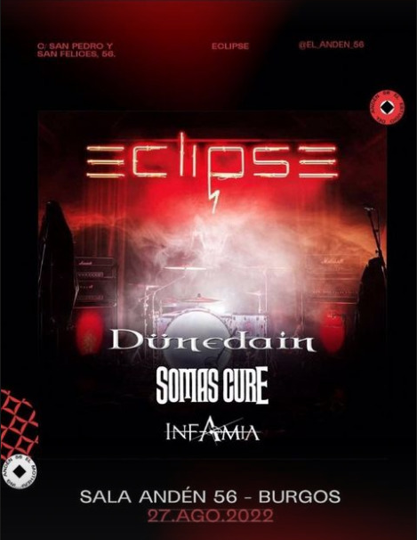 Os recordamos que este sábado 27 de agosto tendrá lugar en la sala Andén 56 de Burgos uno de los conciertos del verano. Y es que allí se darán cita los suecos Eclipse junto a tres invitados de excepción: Dünedain, Somas Cure e Infamia.