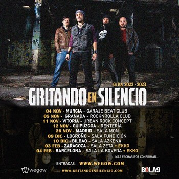 Los sevillanos, Gritando en Silencio vuelven a la carretera para su gira 2022/2023 en la que recorrerán buena parte de la península ofreciéndonos su rock urbano. El inicio de esta gira tendrá lugar el próximo 4 de noviembre en Murcia y aunque se esperan más fechas, os dejamos con las que ya tienen cerradas. Las entradas ya están a la venta a través de Wegow desde 12€ (+ gastos).